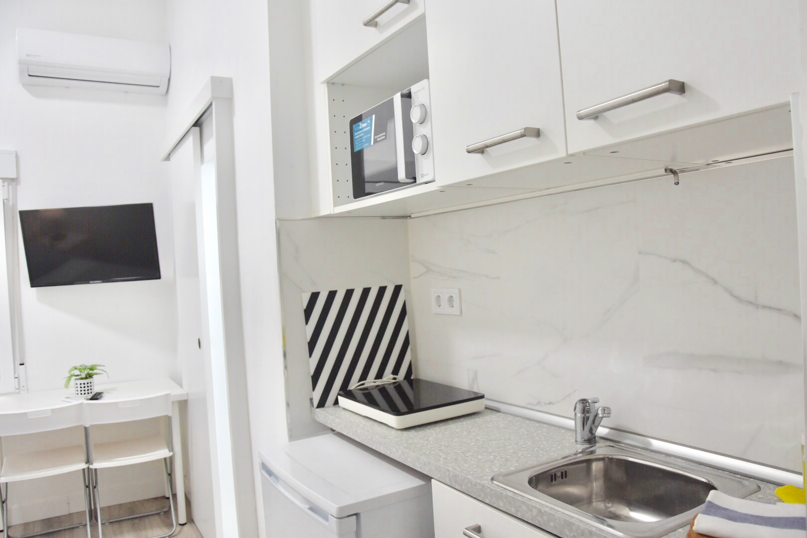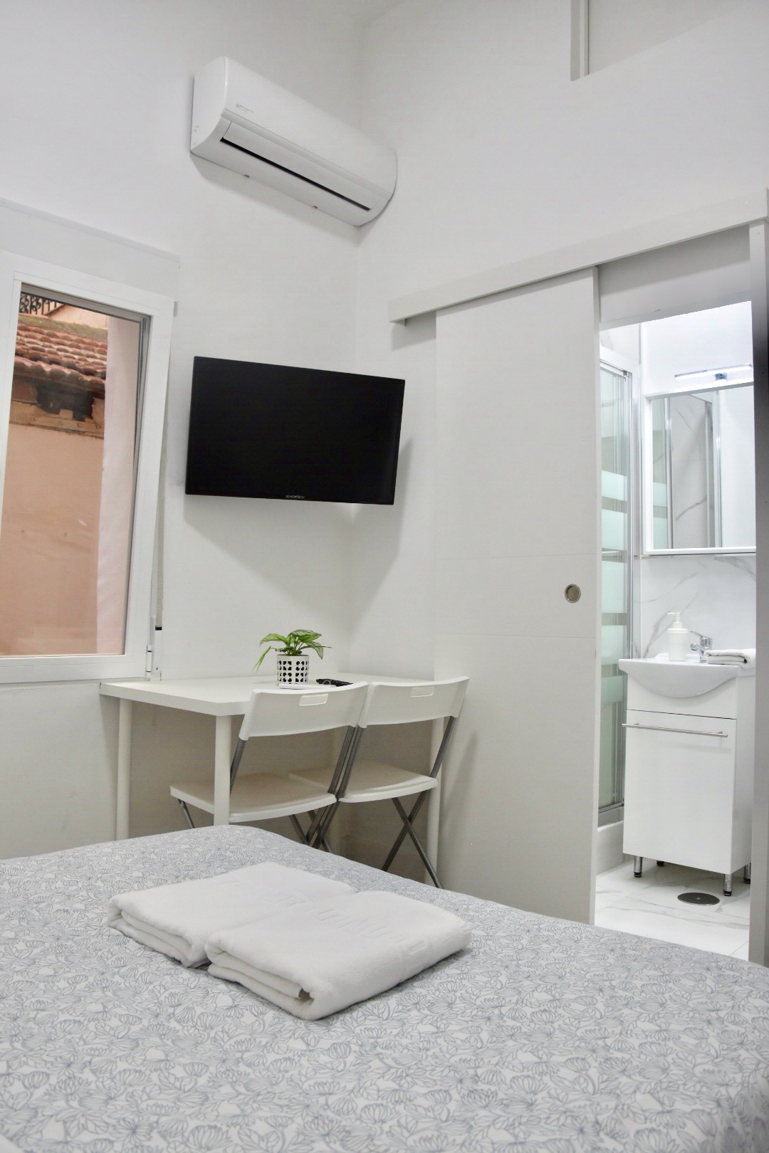 Pequeño y acogedor Estudio PRIVADO, 19mt2, para 2 persona, equipado con complementos básicos. Persianas. No necesita ascensor. El estudio consta de cama matrimonial de 1,35, aire acondicionado, TV32″, calefacción, BAÑO PRIVADO, agua caliente, cocina de una hornilla, batería de cocina, armarios, ventana exterior, WIFI. Metro cercano: 6 min caminando, IBIZA; GOYA, PPE DE VERGARA. Autobuses 24h. 6 -10 min caminando al PARQUE del RETIRO, Puerta de ALCALÁ, 12 min CIBELES, GRAN VIA. 15 MIN MUSEOS.