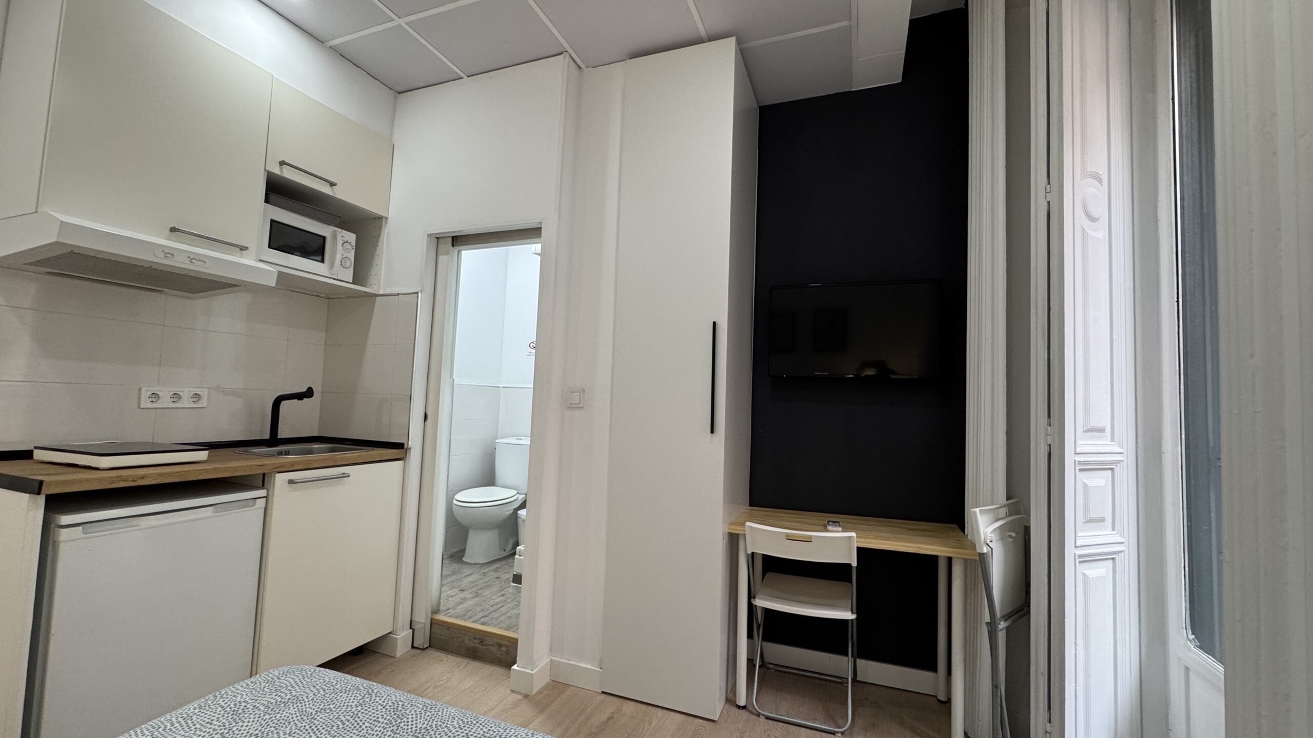Amoblado Tv 32″, cocina, Microondas, nevera, tostadora y utensilios de cocina. Con un Balcón y ventanal grande a la calle. Calefacción aire frío/caliente. Por temas de SALUBRIDAD NO incluyo sal, azúcar, especias para cocinar. Primera planta SIN ASCENSOR.